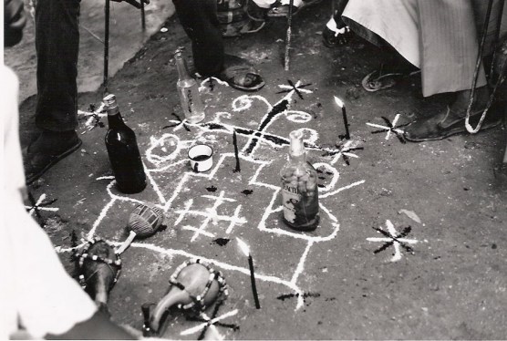 Photo 2: Photo by Lois Wilcken of vèvè (ritual diagram) for Gede, spirit of the dead, traced on the earth floor of a Vodou space in cornflour and coffee by Manbo (female priest) Fancilia Chery, Port-au-Prince, November 1987.