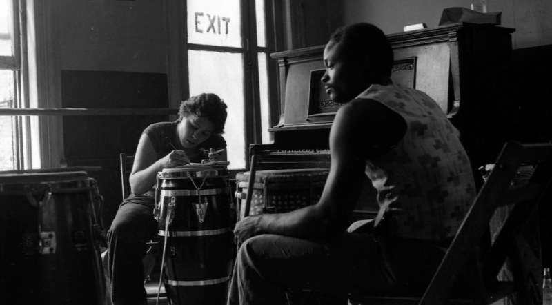 Featured Image: Photo by Lois Wilcken of Frisner Augustin teaching a Haitian drumming class at Fazil’s Studio in the Clinton neighborhood, Manhattan, 20 June 1981. To the left, the late drummer Bonnie Devlin takes notes.