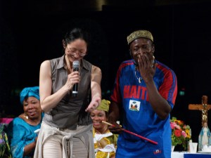Tokyo Summer Festival, organized by the Arion-Edo Foundation in collaboration with Asahi Shimbun (Morning Sun Newspaper, one of Japan’s national dailies), was established in 1985 by pianist Kyoko Edo, composer Maki Ishii, and musicologist Tashi Funayama as Tokyo’s first international music festival. It distinguished itself, too, as the first festival directed entirely by musicians. Each year featured a theme, for example, “Patterns of Laughter: Masques, Music, and Buffoonery” (1995) and “Music and Literature” (2002). Makandal performed Vodou theatre in the Festival’s 2007 edition, “Towards the Islands, Sounds across the Sea.” The Festival’s Wikipedia entry records no festivals after 2008, and its website is no longer published. In a letter dated 8 August 2007 the Festival granted Makandal permission to use the photos on condition that it credit the photographers and the Festival.